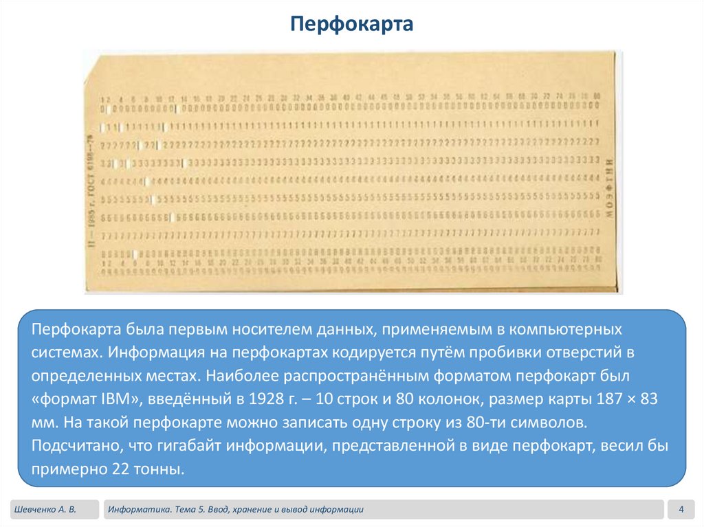 ПерфокартаПерфокарта была первым носителем данных, применяемым в компьютерных