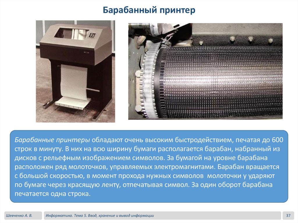 Барабанный принтерБарабанные принтеры обладают очень высоким быстродействием, печатая до 600