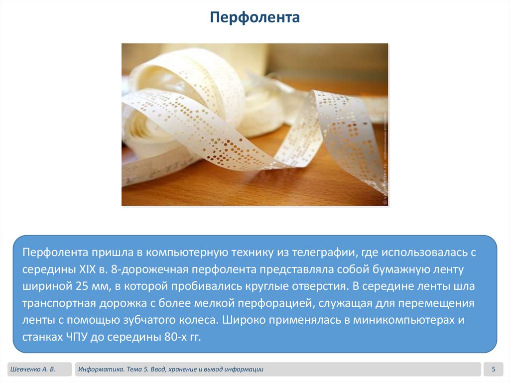 ПерфолентаПерфолента пришла в компьютерную технику из телеграфии, где использовалась с