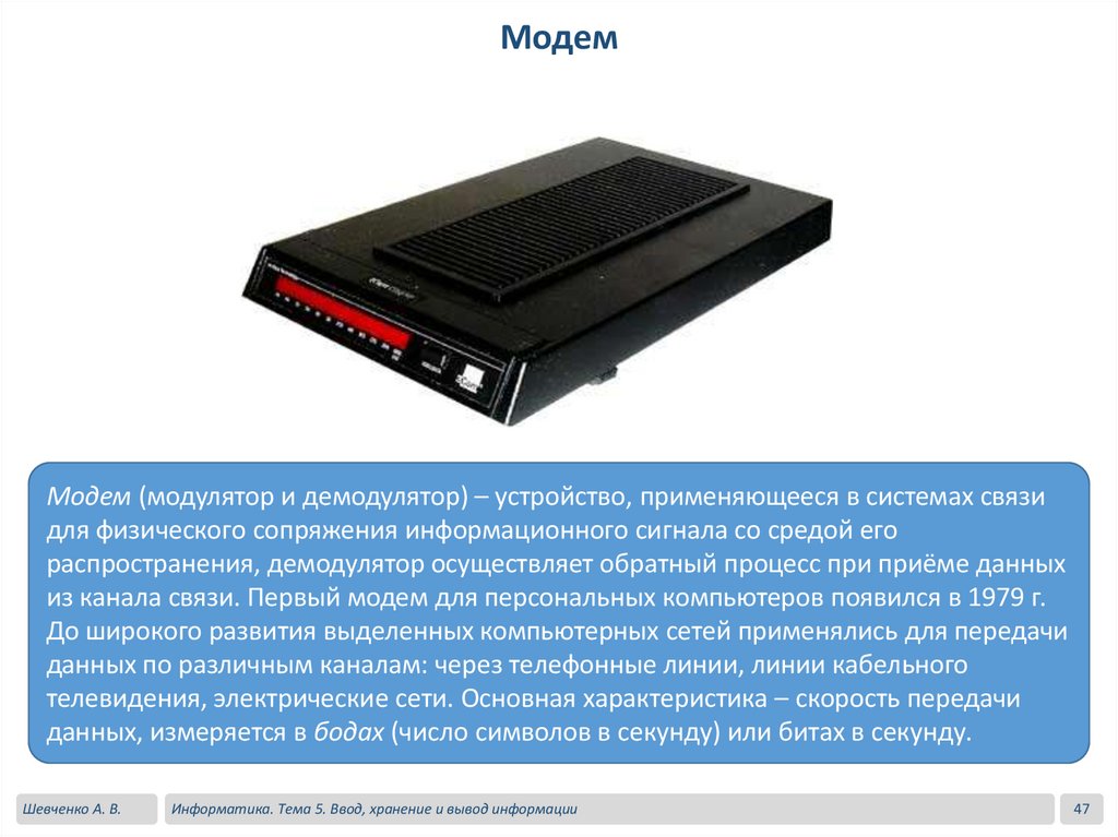 из канала связи. Первый модем для персональных компьютеров появился в 1979 г.