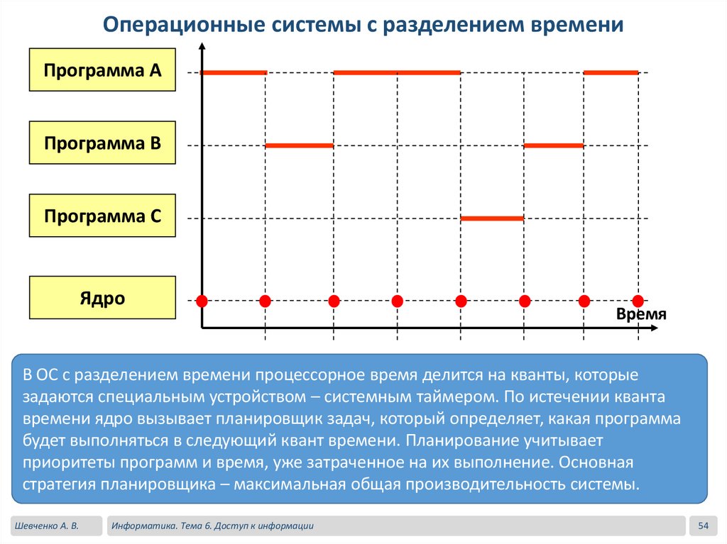 времени ядро вызывает планировщик задач, который определяет, какая программа