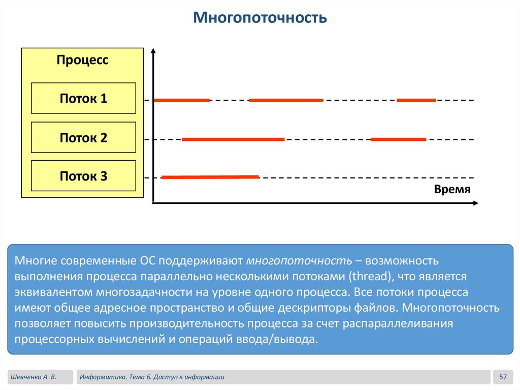 имеют общее адресное пространство и общие дескрипторы файлов. Многопоточность