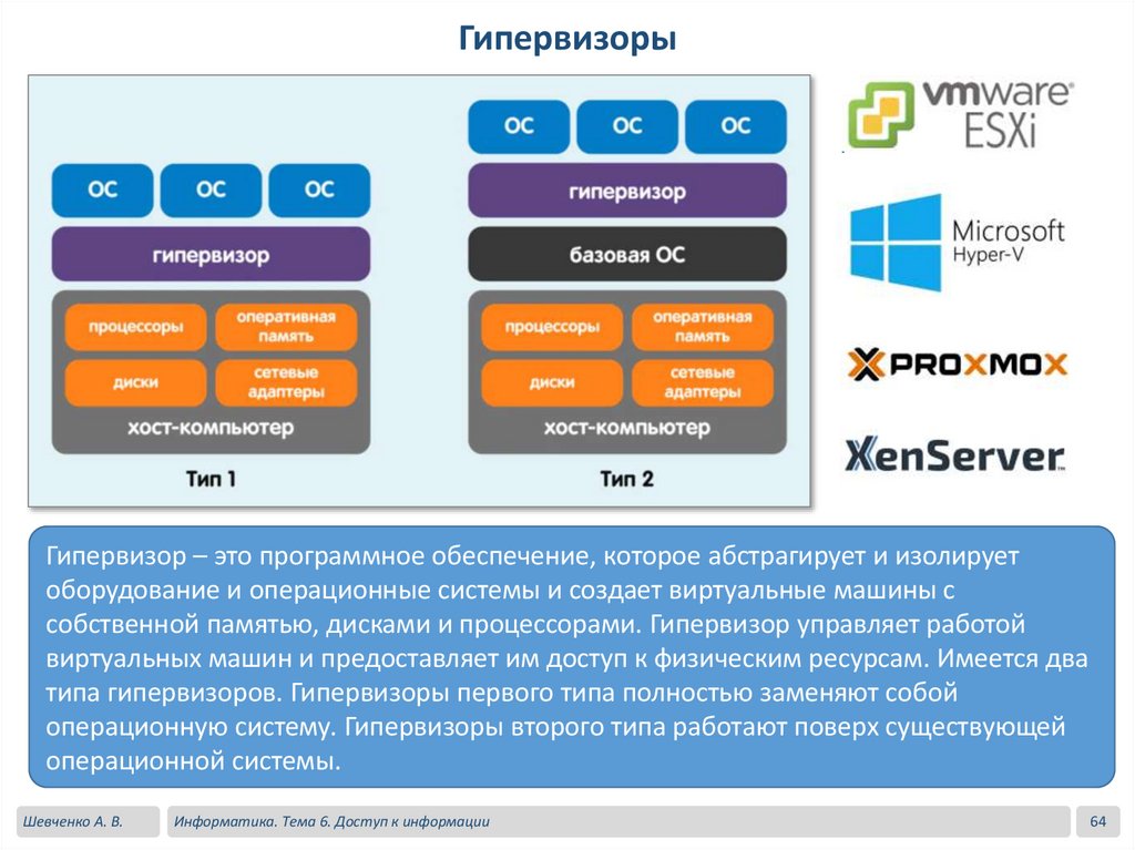 виртуальных машин и предоставляет им доступ к физическим ресурсам. Имеется два
