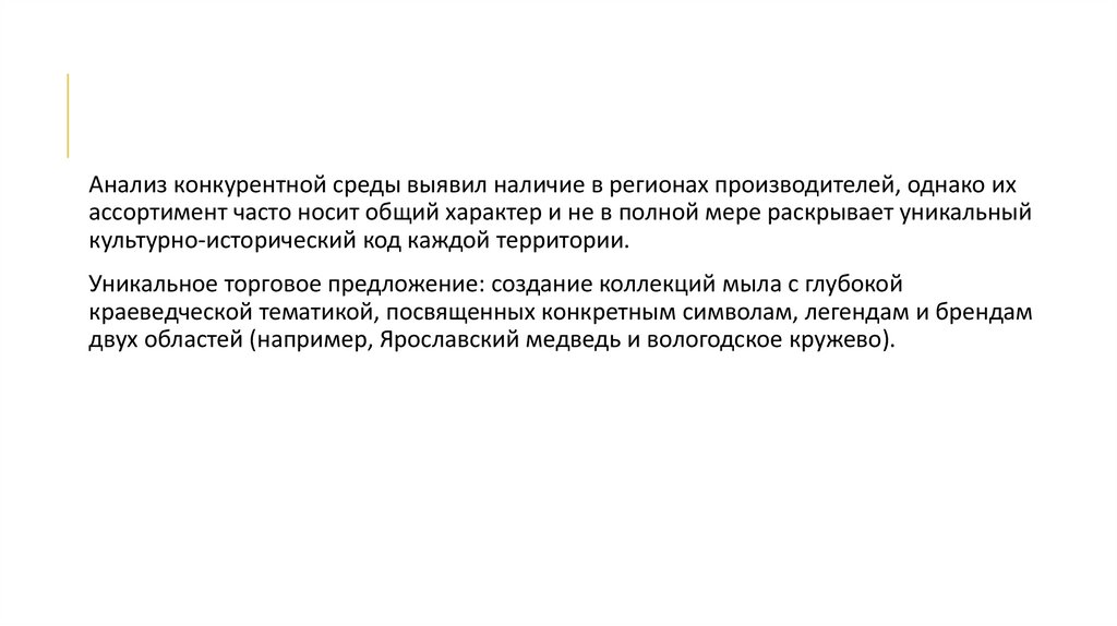 Анализ конкурентной среды выявил наличие в регионах производителей, однако ихассортимент часто носит общий характер и не в полной мере раскрывает уникальный