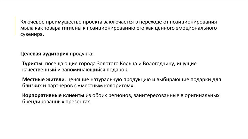 Ключевое преимущество проекта заключается в переходе от позиционированиямыла как товара гигиены к позиционированию его как ценного эмоционального
