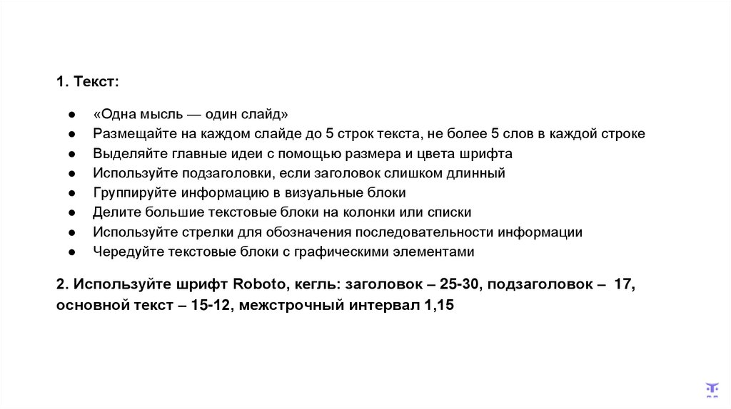 1. Текст:«Одна мысль — один слайд»
