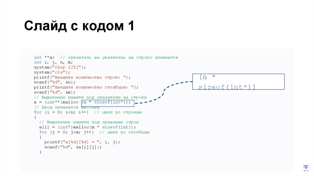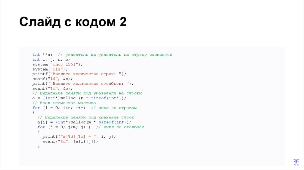 Слайд с кодом 1int **a; // указатель на указатель на строку элементов