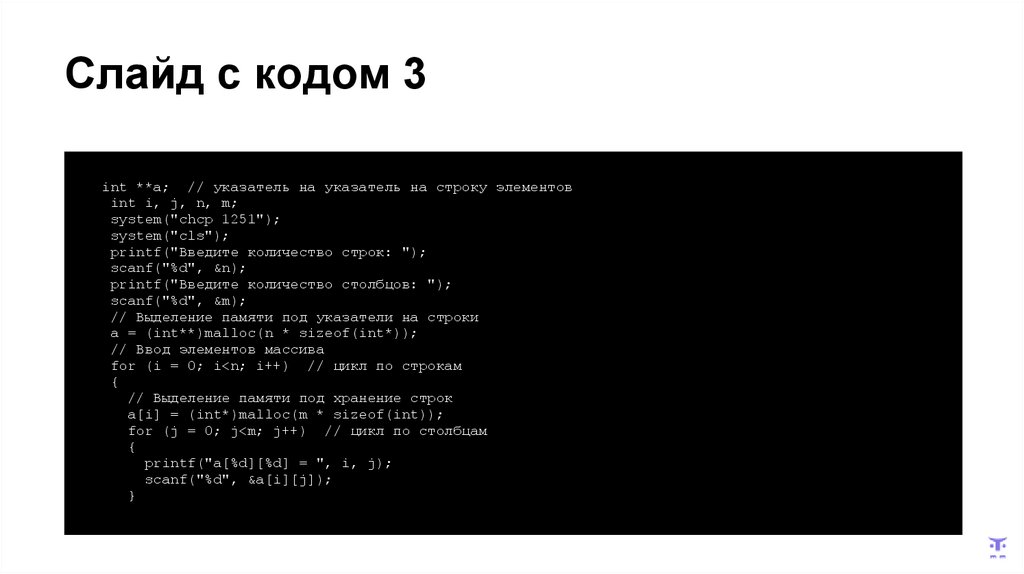 Слайд с кодом 3int **a; // указатель на указатель на строку элементов