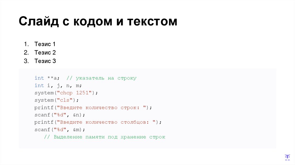Слайд с кодом и текстом1. Тезис 1