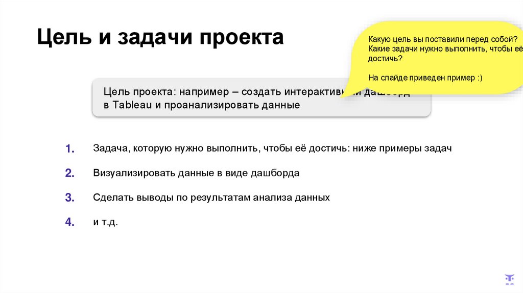 Цель проекта: например – создать интерактивный дашборд