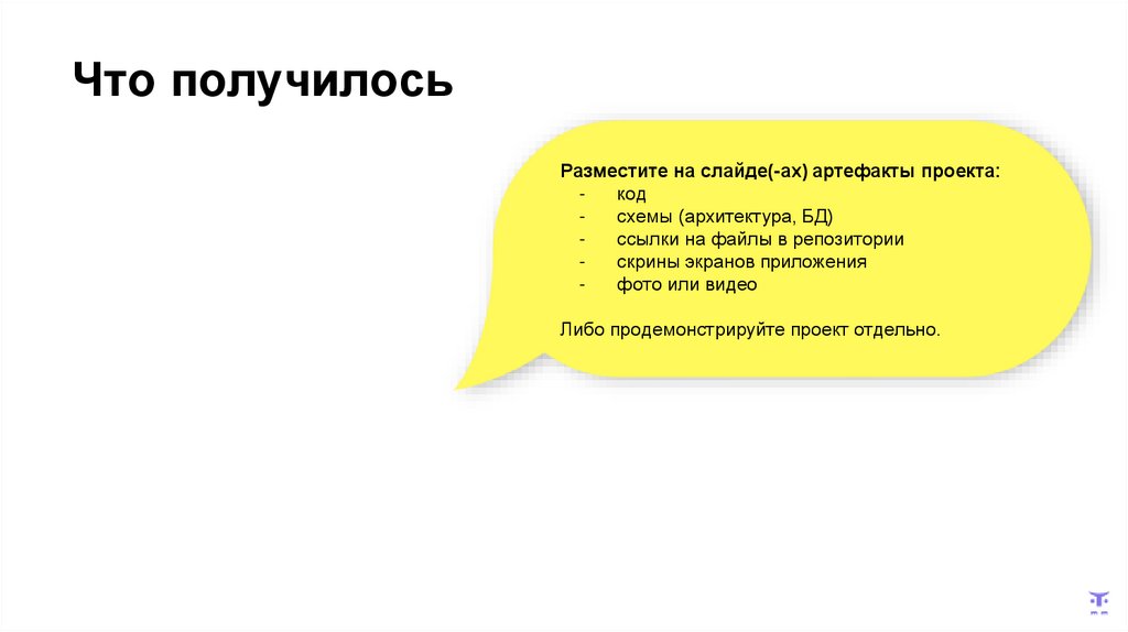 Что получилосьРазместите на слайде(-ах) артефакты проекта: