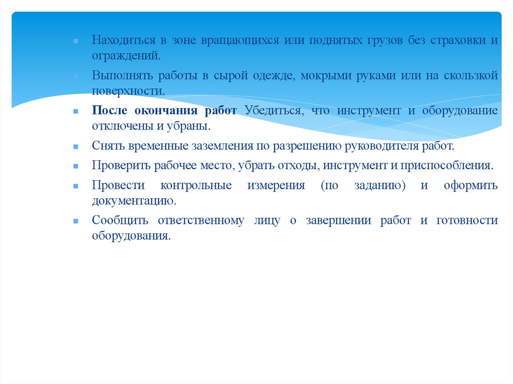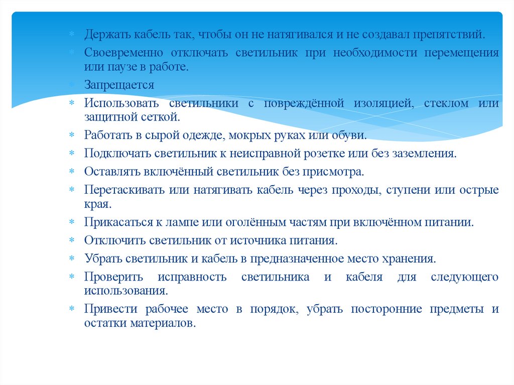 Проверять исправность оборудования, кабелей, приборов и защитных