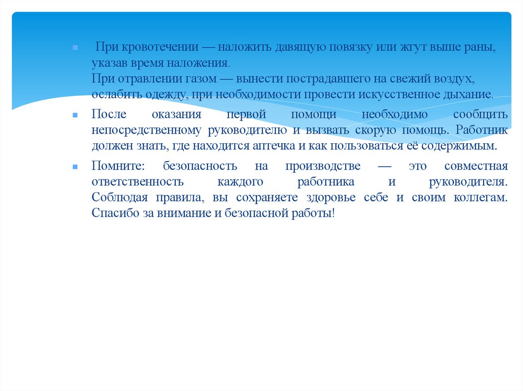 Каждый работник обязан уметь оказать первую доврачебную помощьпострадавшему до прибытия медицинских работников.