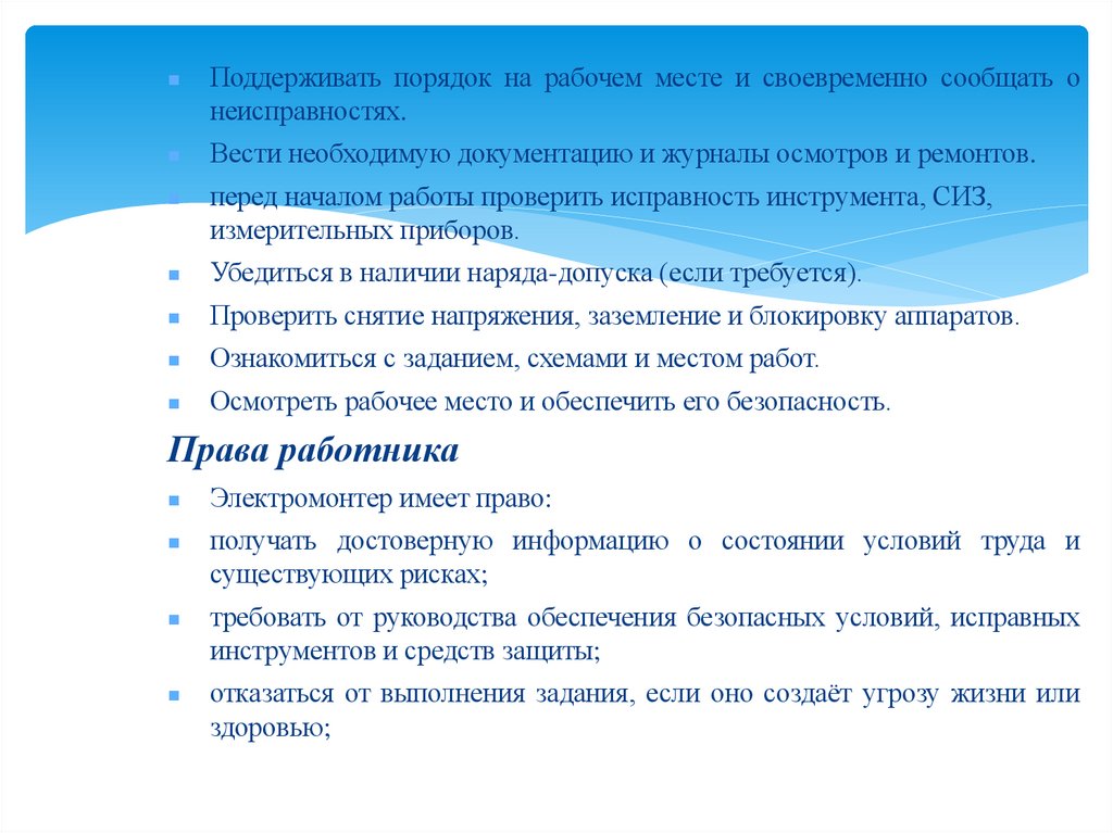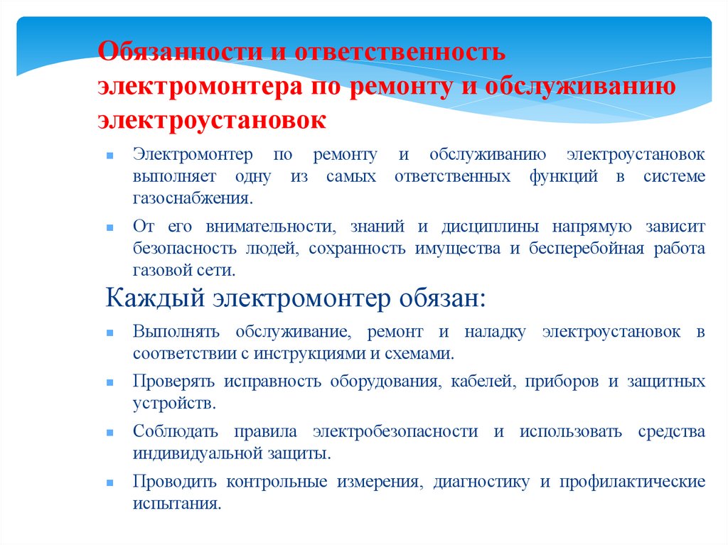 Обязанности и ответственностьэлектромонтера по ремонту и обслуживанию