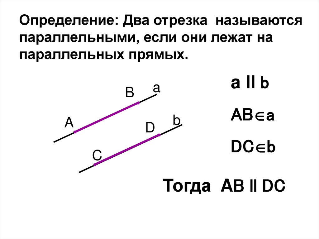 Определение: Два отрезка называютсяпараллельными, если они лежат на