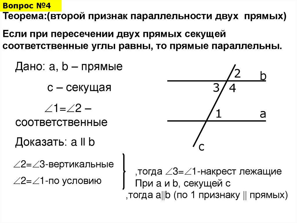 Вопрос №4Теорема:(второй признак параллельности двух прямых)