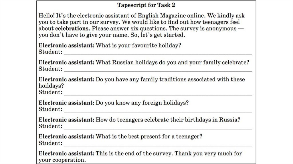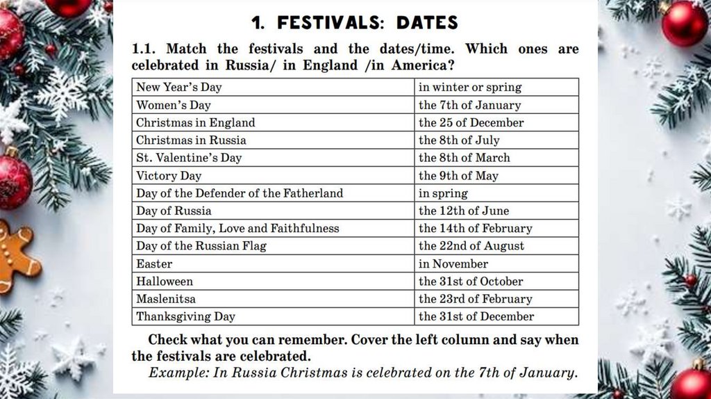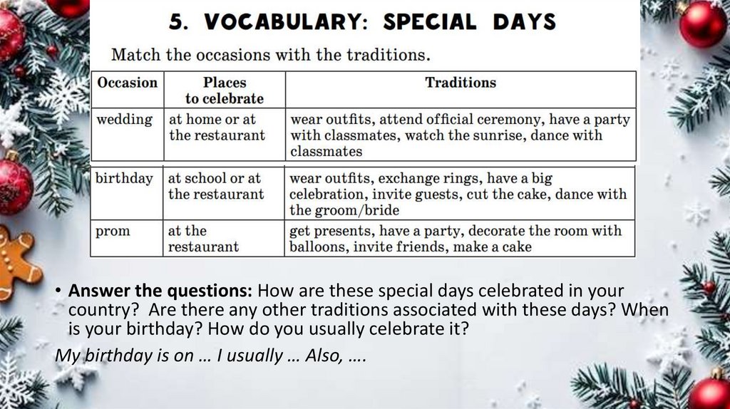 • Answer the questions: How are these special days celebrated in yourcountry? Are there any other traditions associated with these days? When