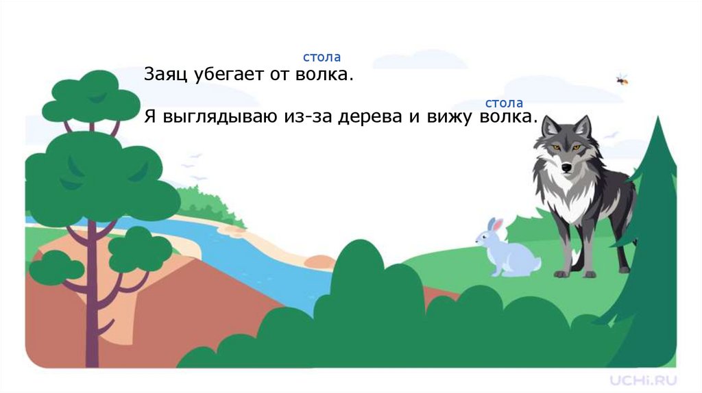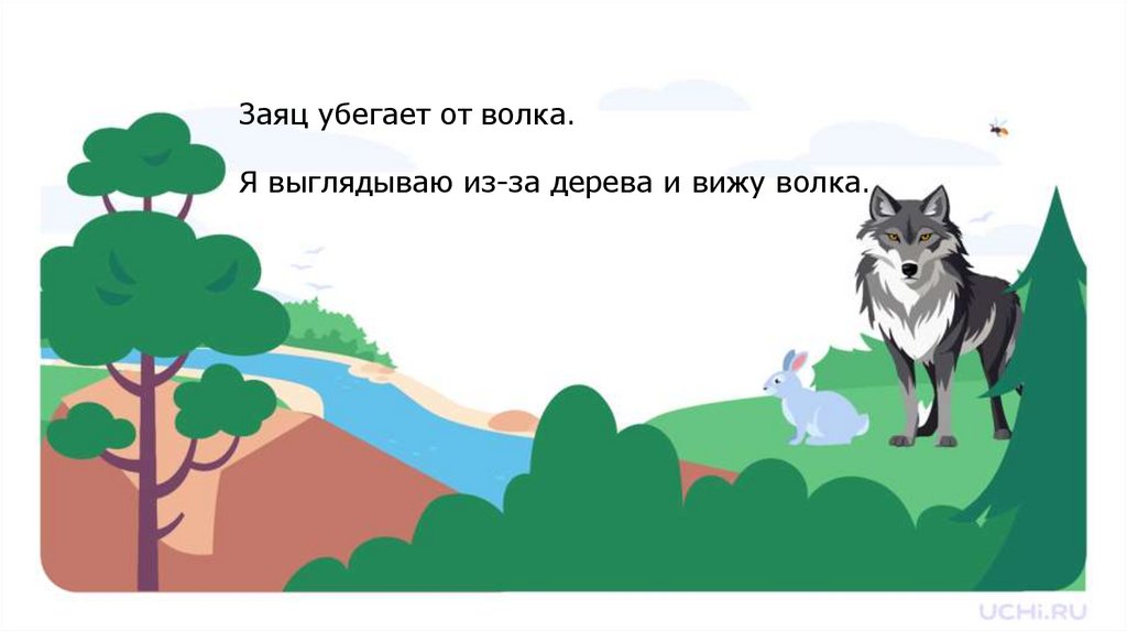 Заяц убегает от волка.Я выглядываю из-за дерева и вижу волка.