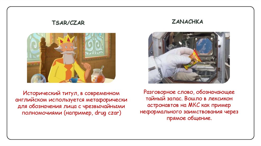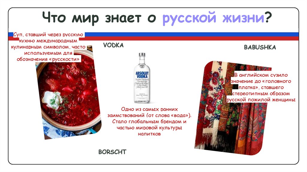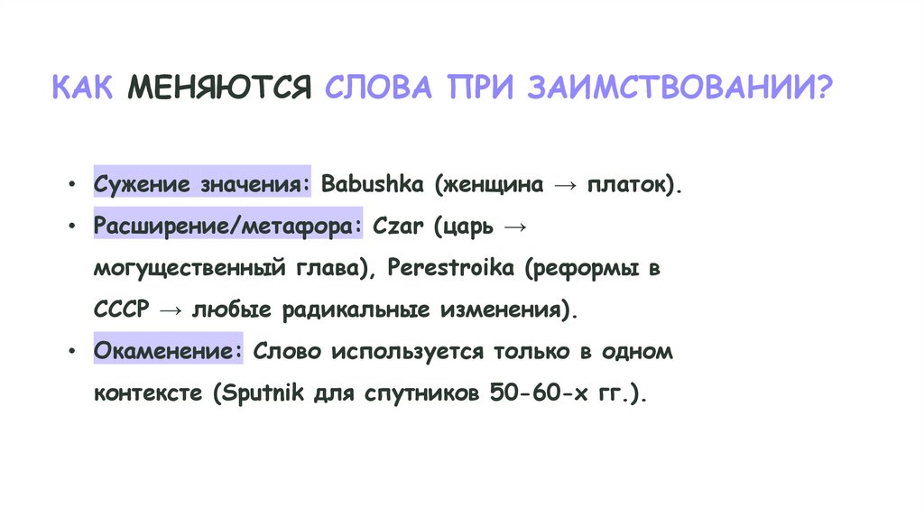 КАК МЕНЯЮТСЯ СЛОВА ПРИ ЗАИМСТВОВАНИИ?• Сужение значения: Babushka (женщина → платок).