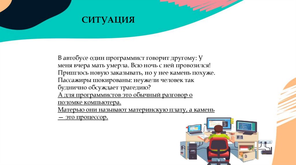 СИТУАЦИЯВ автобусе один программист говорит другому: У