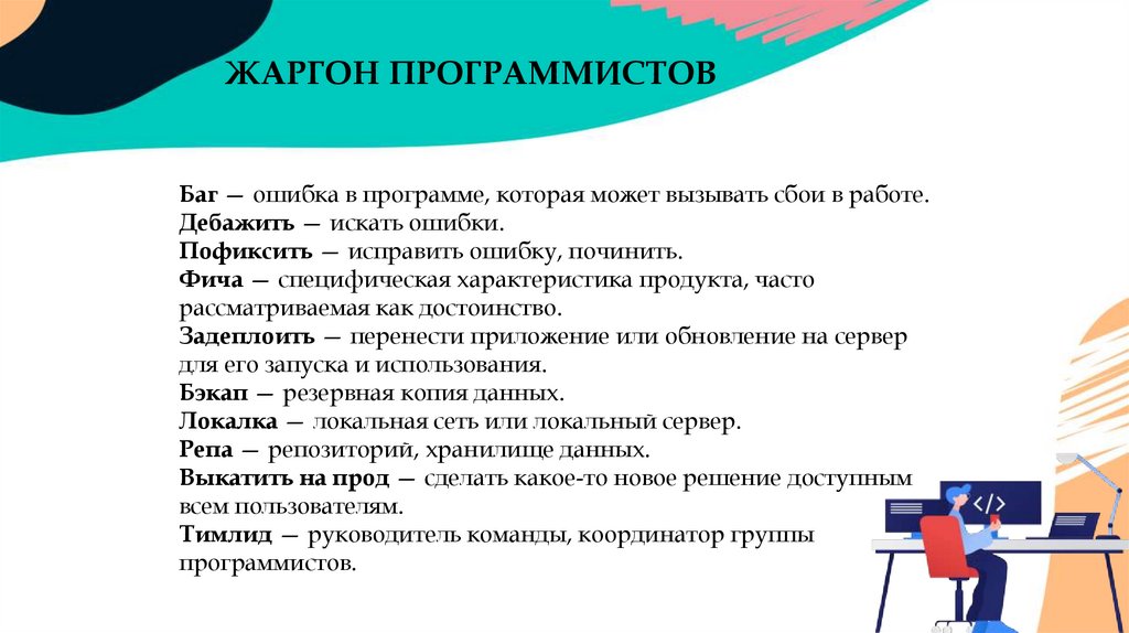 ЖАРГОН ПРОГРАММИСТОВБаг — ошибка в программе, которая может вызывать сбои в работе.
