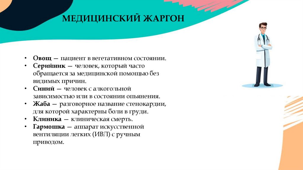 МЕДИЦИНСКИЙ ЖАРГОН• Овощ — пациент в вегетативном состоянии.