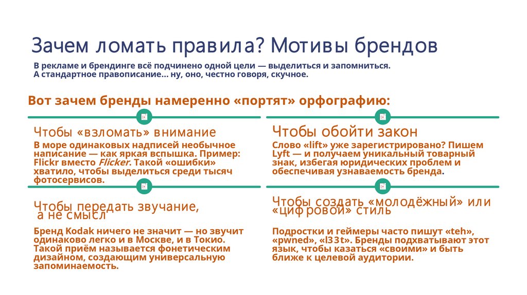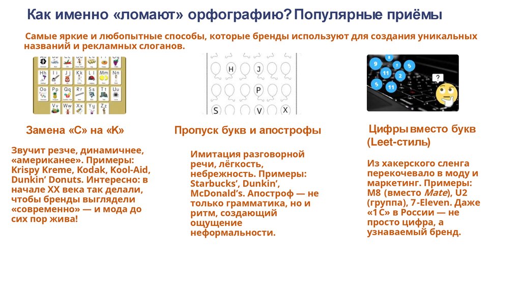 Как именно «ломают» орфографию? Популярные приёмыСамые яркие и любопытные способы, которые бренды используют для создания уникальных