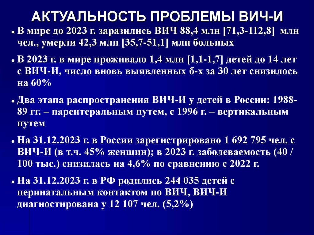 АКТУАЛЬНОСТЬ ПРОБЛЕМЫ ВИЧ-ИВ мире до 2023 г. заразились ВИЧ 88,4 млн [71,3-112,8] млн