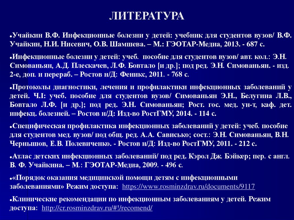 ЛИТЕРАТУРАУчайкин В.Ф. Инфекционные болезни у детей: учебник для студентов вузов/ В.Ф.