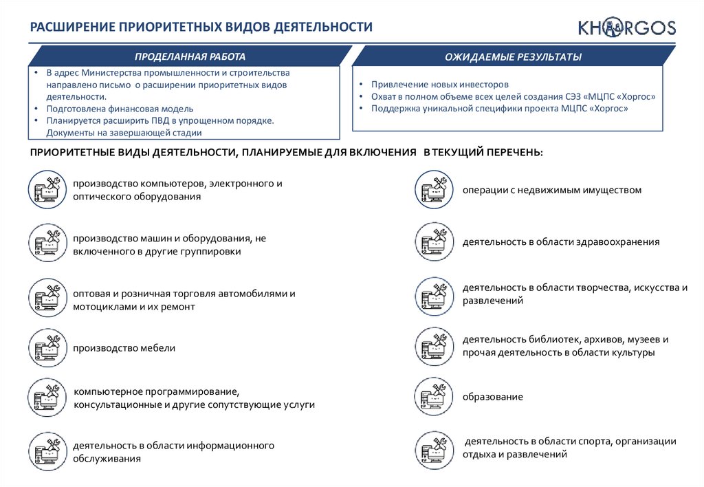 • Охват в полном объеме всех целей создания СЭЗ «МЦПС «Хоргос»