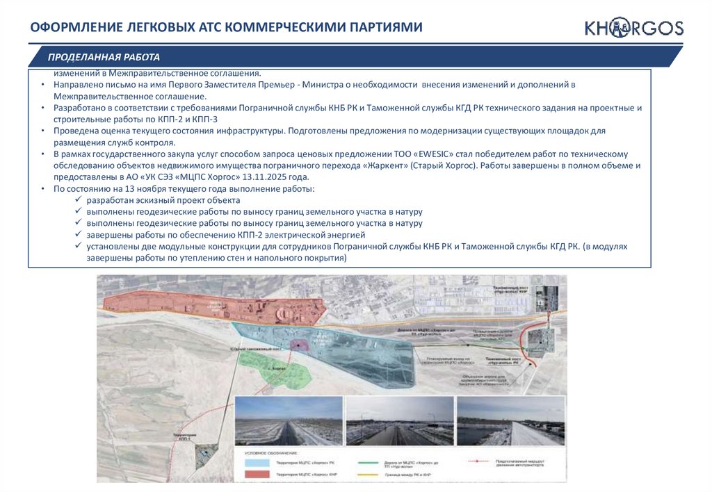 ОФОРМЛЕНИЕ ЛЕГКОВЫХ АТС КОММЕРЧЕСКИМИ ПАРТИЯМИ• Технологический процесс согласован с заинтересованными государственными органами (ДГД Области Жетісу, пограничная служба).