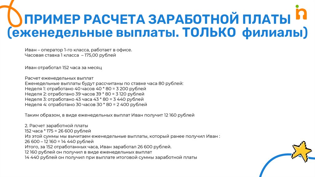 ПРИМЕР РАСЧЕТА ЗАРАБОТНОЙ ПЛАТЫ(еженедельные выплаты. ТОЛЬКО филиалы)