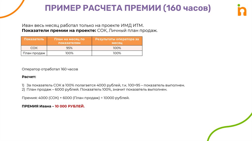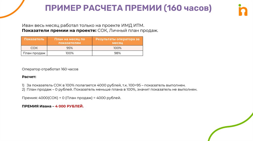 ПРИМЕР РАСЧЕТА ПРЕМИИ (160 часов)Иван весь месяц работал только на проекте ИМД ИТМ.