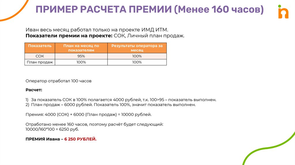 ПРИМЕР РАСЧЕТА ПРЕМИИ (Менее 160 часов)Иван весь месяц работал только на проекте ИМД ИТМ.