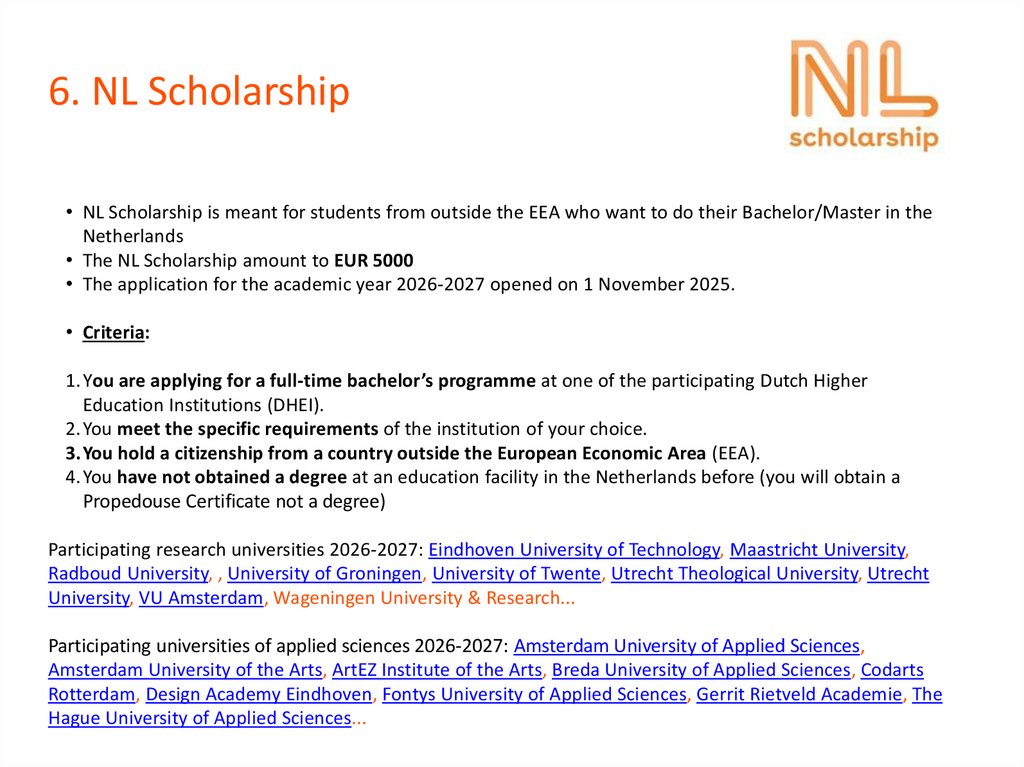 6. NL Scholarship• NL Scholarship is meant for students from outside the EEA who want to do their Bachelor/Master in the