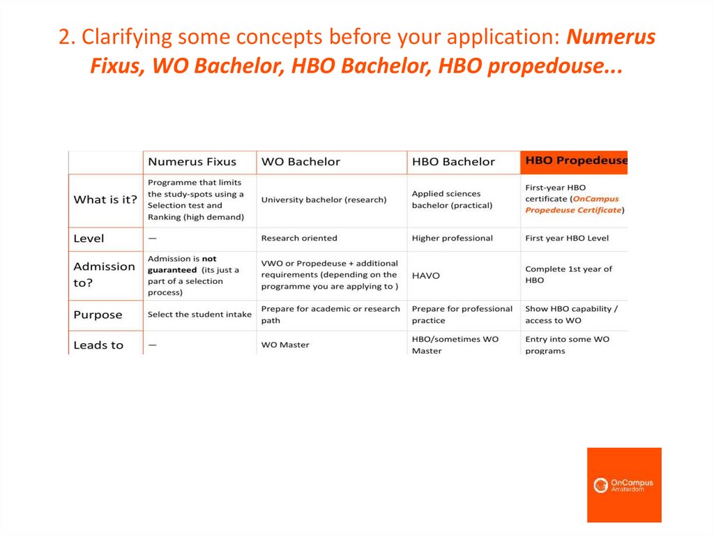 2. Clarifying some concepts before your application: NumerusFixus, WO Bachelor, HBO Bachelor, HBO propedouse...