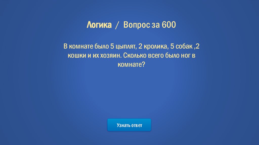 16. Правильный ответ Логика / Вопрос за 600 2 . Только у хозяина . У остальных лапы