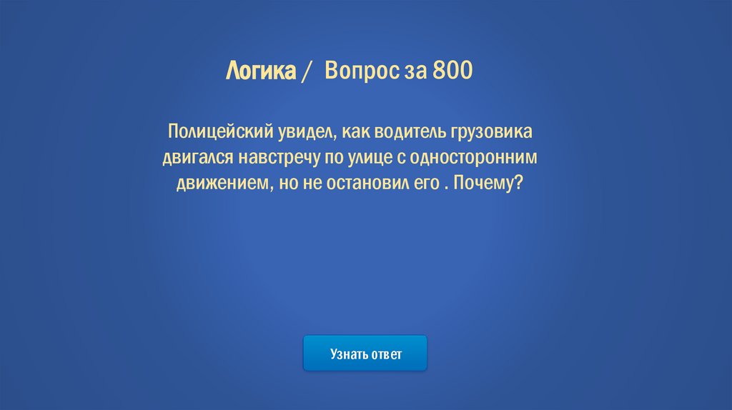 18. Правильный ответ Логика / Вопрос за 800 Водитель грузовика шел пешком