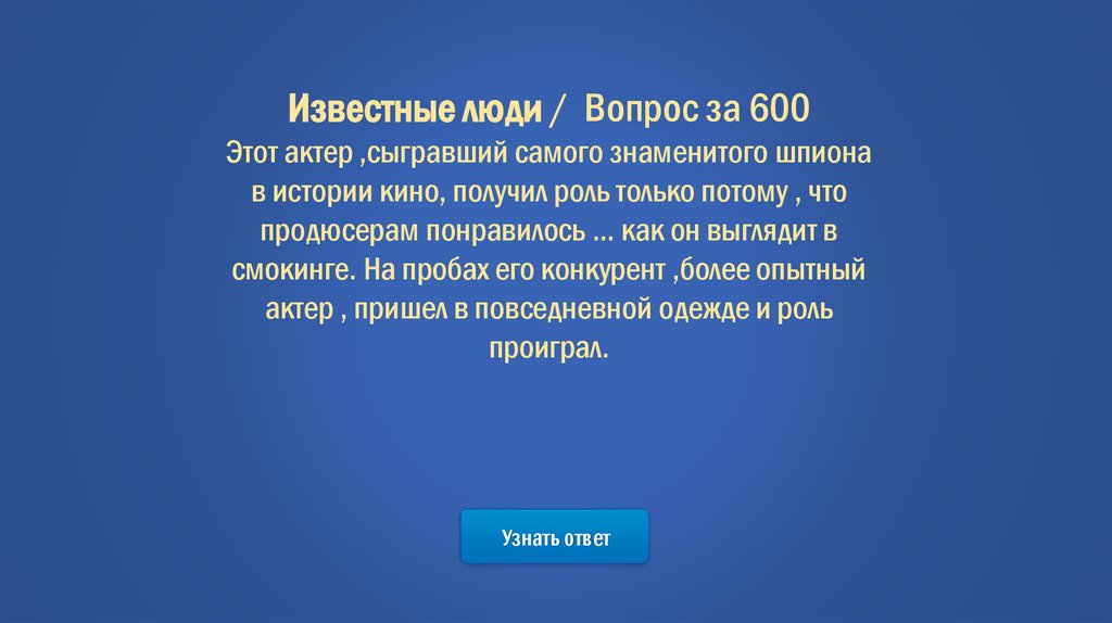 8. Правильный ответ Известные люди / Вопрос за 600 Шон Коннери ( роль Джеймса Бонда )