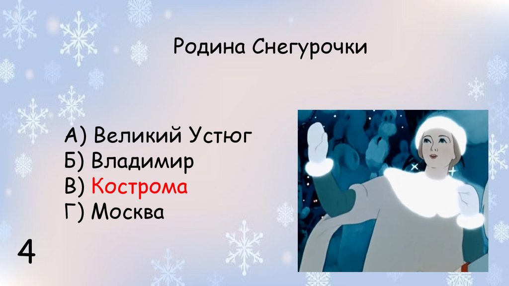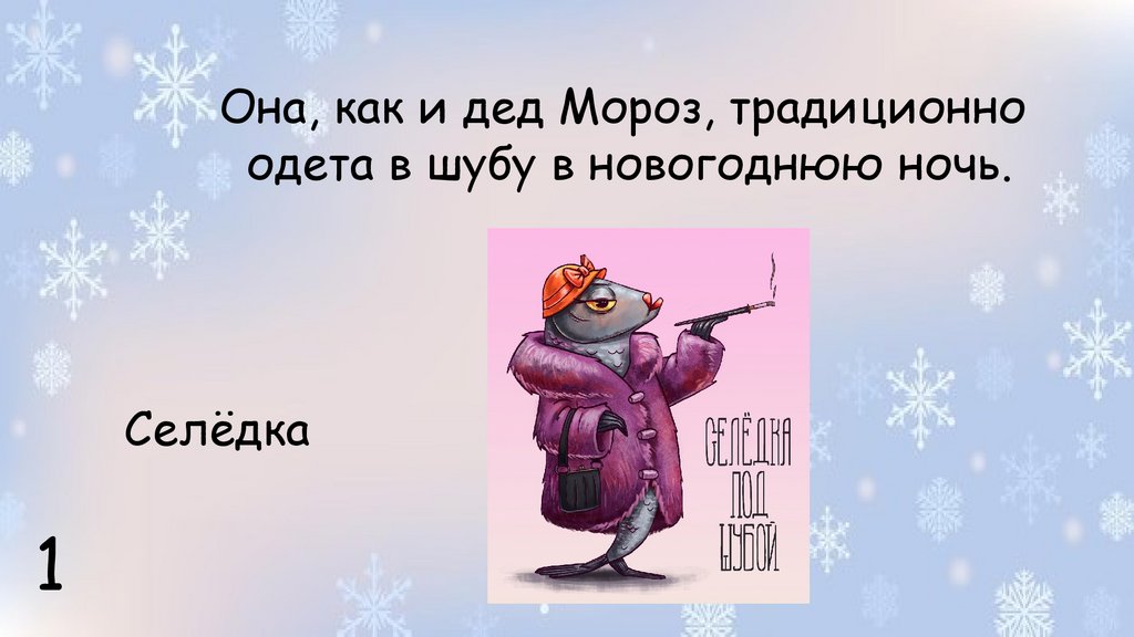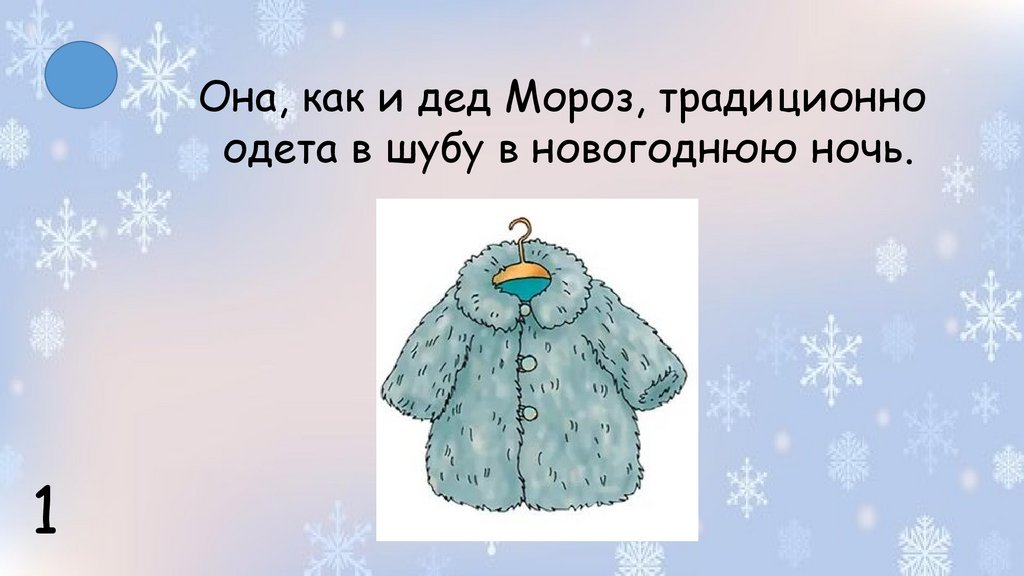 Она, как и дед Мороз, традиционноодета в шубу в новогоднюю ночь.