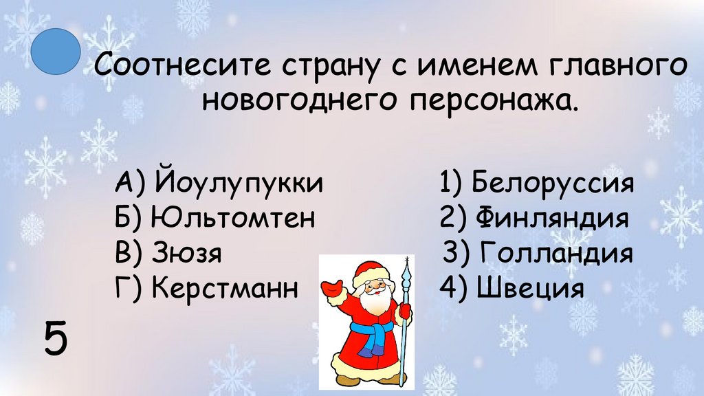 Соотнесите страну с именем главногоновогоднего персонажа.
