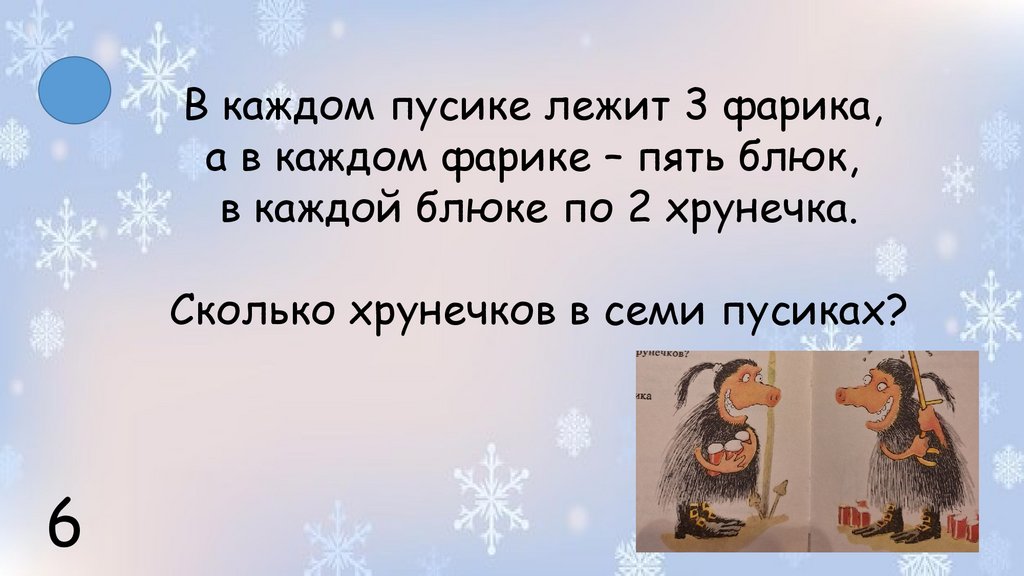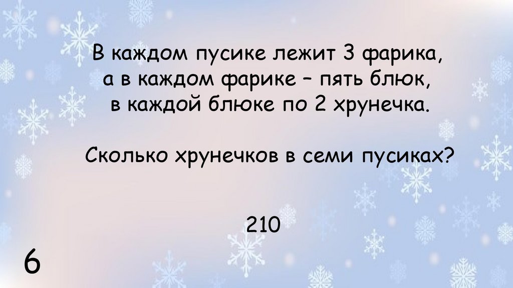 В каждом пусике лежит 3 фарика,а в каждом фарике – пять блюк,