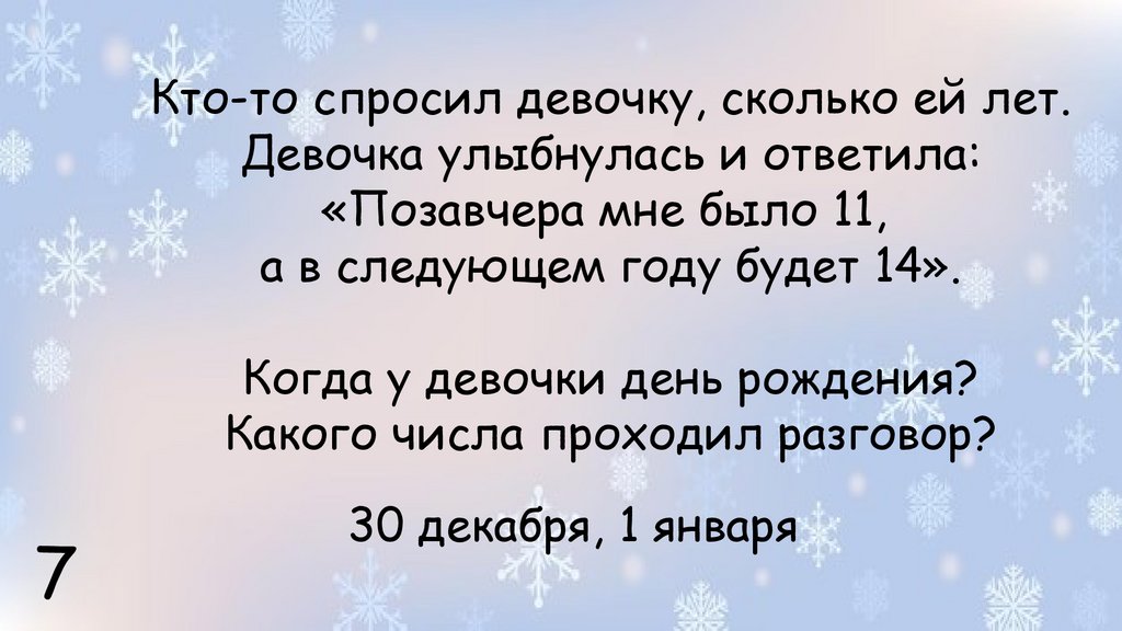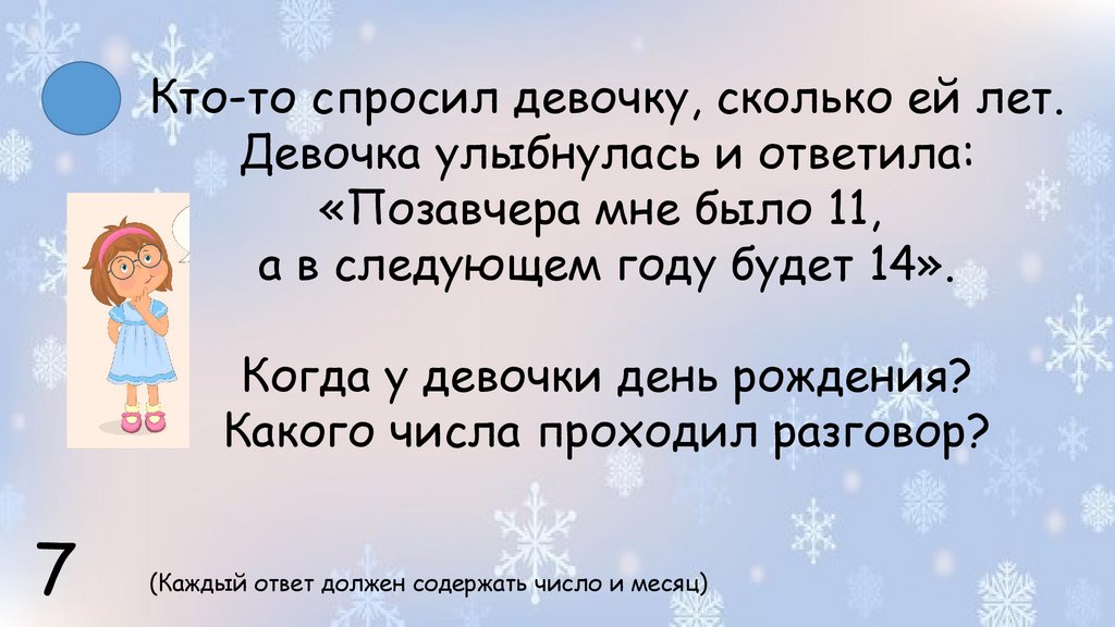 Кто-то спросил девочку, сколько ей лет.Девочка улыбнулась и ответила: