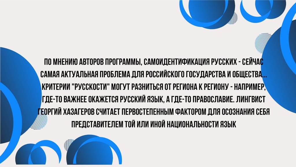 По мнению авторов программы, самоидентификация русских - сейчассамая актуальная проблема для российского государства и общества...