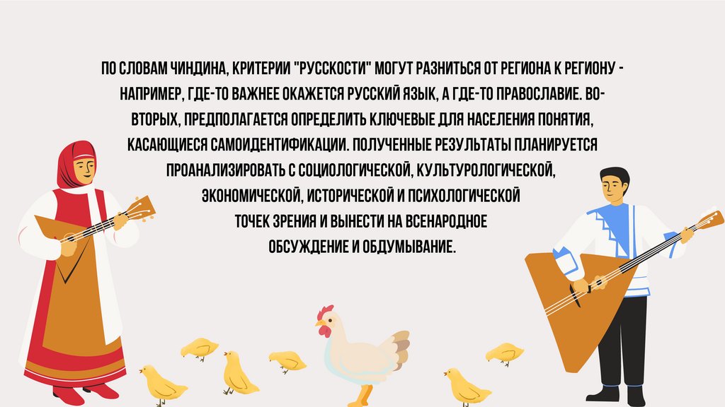 По словам Чиндина, критерии "русскости" могут разниться от региона к региону например, где-то важнее окажется русский язык, а где-то православие. Вовторых, предполагается определить ключевые для населения понятия,касающиеся самоидентификации. Полученные результаты планируется