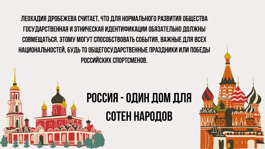 Леокадия Дробежева считает, что для нормального развития обществагосударственная и этническая идентификации обязательно должны