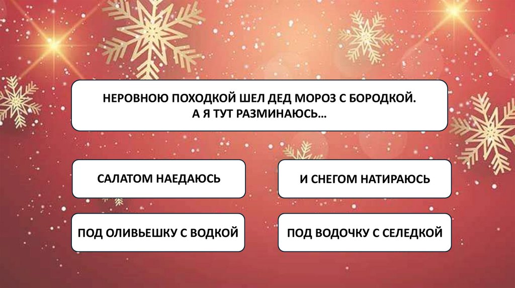 НЕРОВНОЮ ПОХОДКОЙ ШЕЛ ДЕД МОРОЗ С БОРОДКОЙ.А Я ТУТ РАЗМИНАЮСЬ…