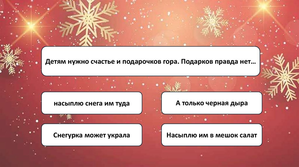Детям нужно счастье и подарочков гора. Подарков правда нет…насыплю снега им туда