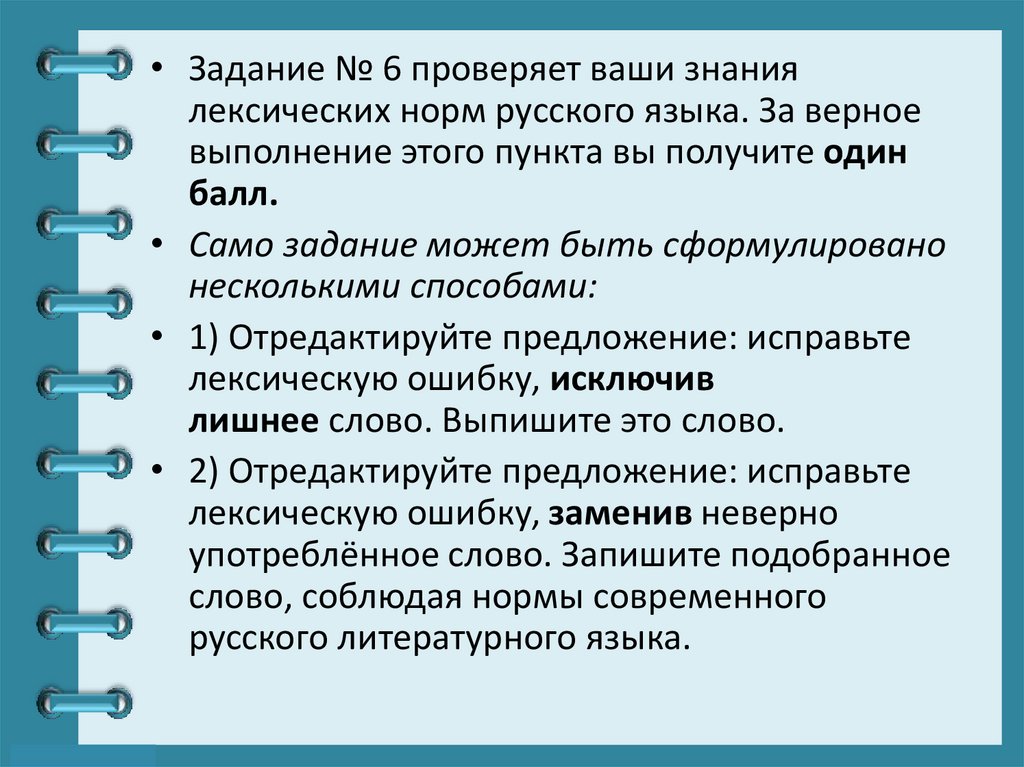 • Задание № 6 проверяет ваши знаниялексических норм русского языка. За верное
