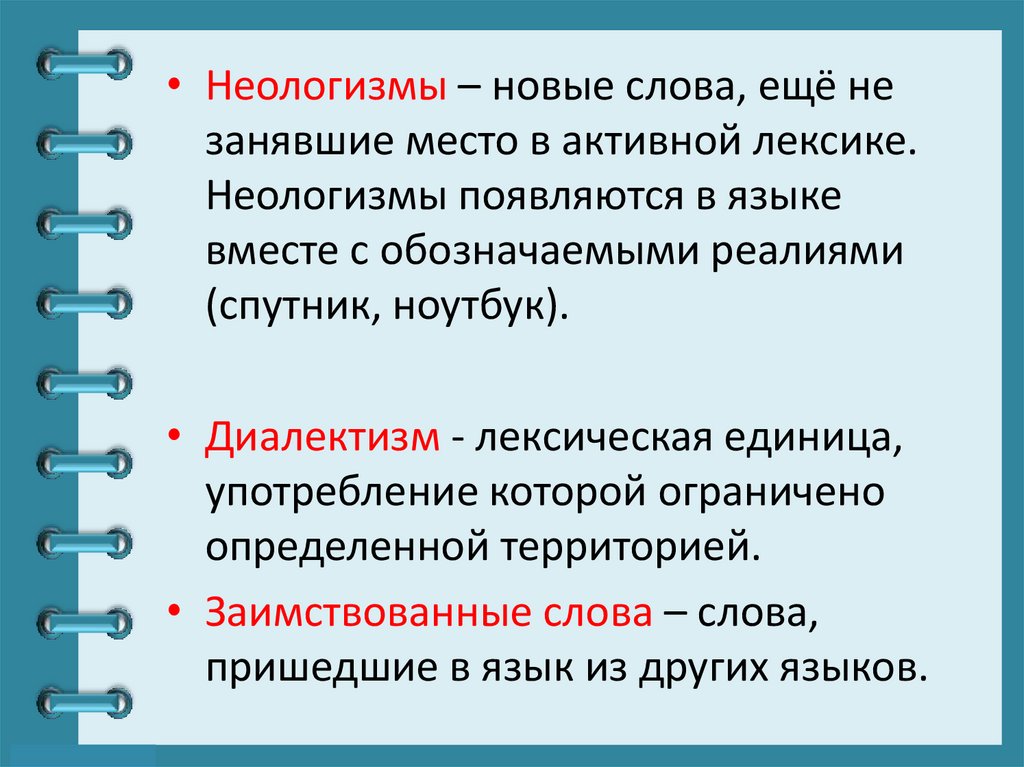 • Неологизмы – новые слова, ещё незанявшие место в активной лексике.